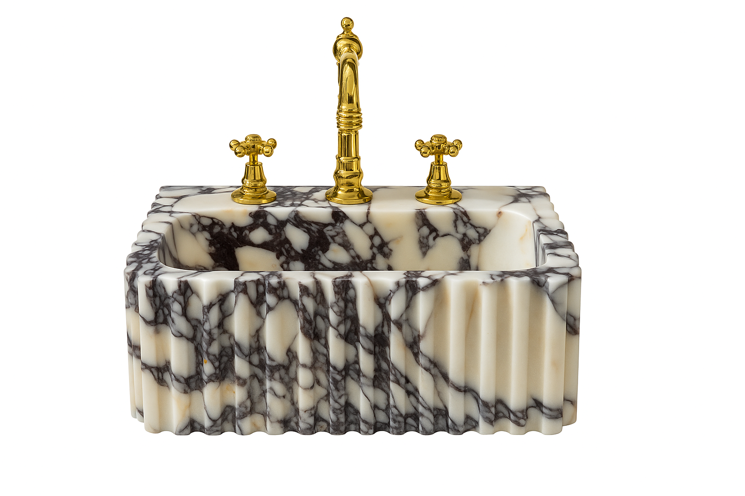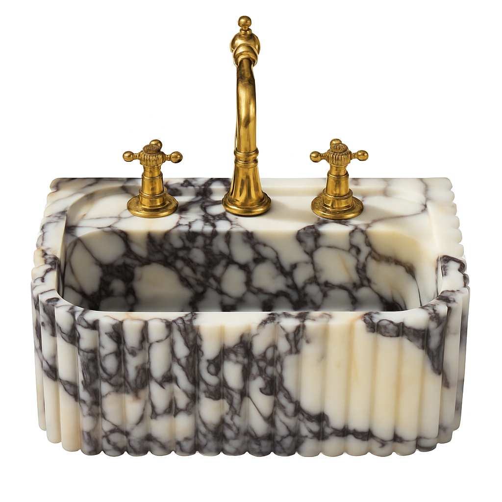 Lille marmor vask med rillet front og sider. Egnet til vægmontage eller fritstående. Laves med eller uden hanehul.