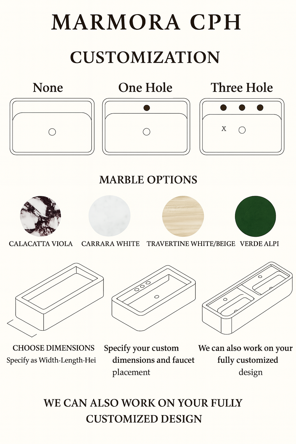 Tilgængelig i Calacatta Viola og Carrera marmor. Kan tilpasses efter kundemål.